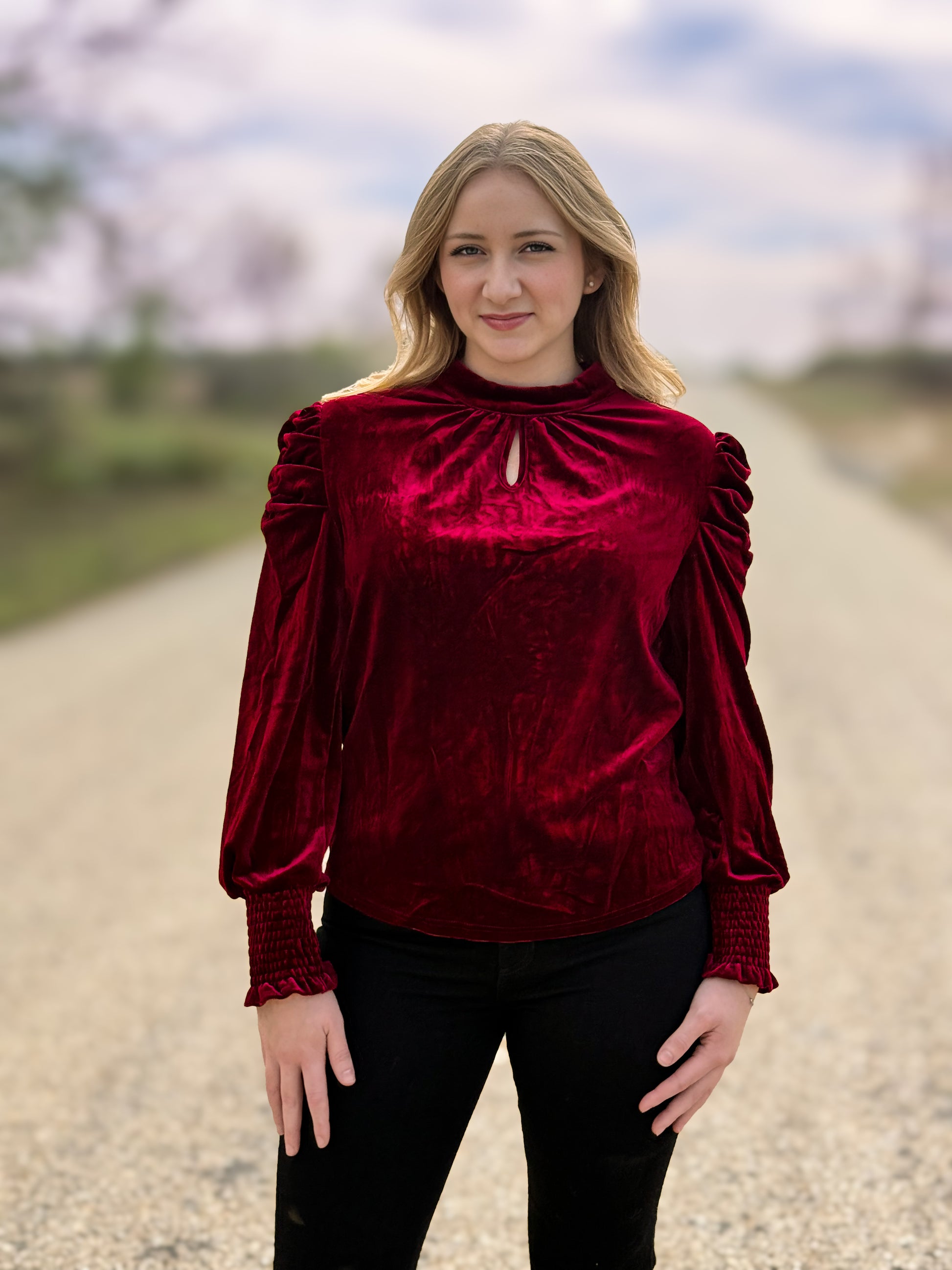Mock Neck Puff Sleeve Velvet Blouse